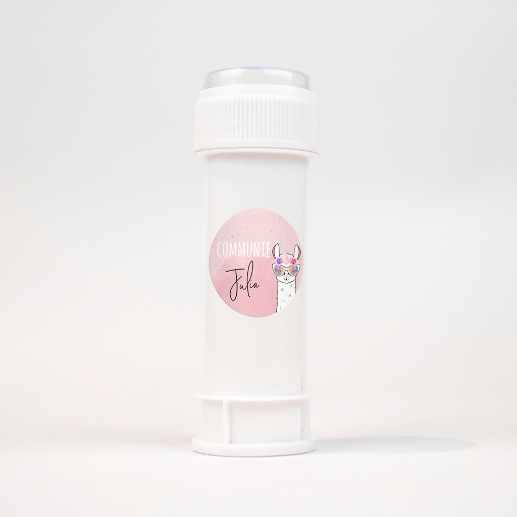 Met deze vrolijke roze sticker in de stijl van de uitnodiging voor de communie maak je er een mooi geheel van! Naast de alpaca met bril staat de naam van jullie dochter met daarboven communie, zo is meteen bij ontvangst van de uitnodiging al duidelijk waar het om gaat, een mooie persoonlijke uitnodiging!
