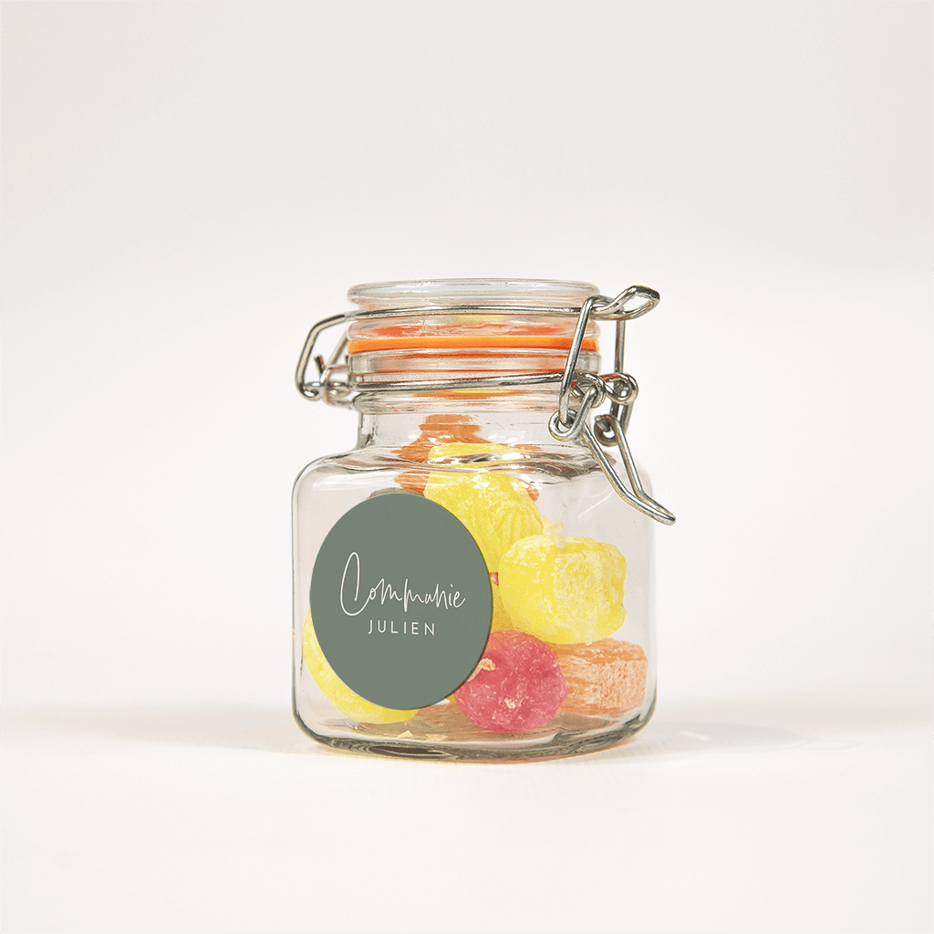 Minimalistische communie sticker met witte naam op donkergroen - vel van 25 stickers