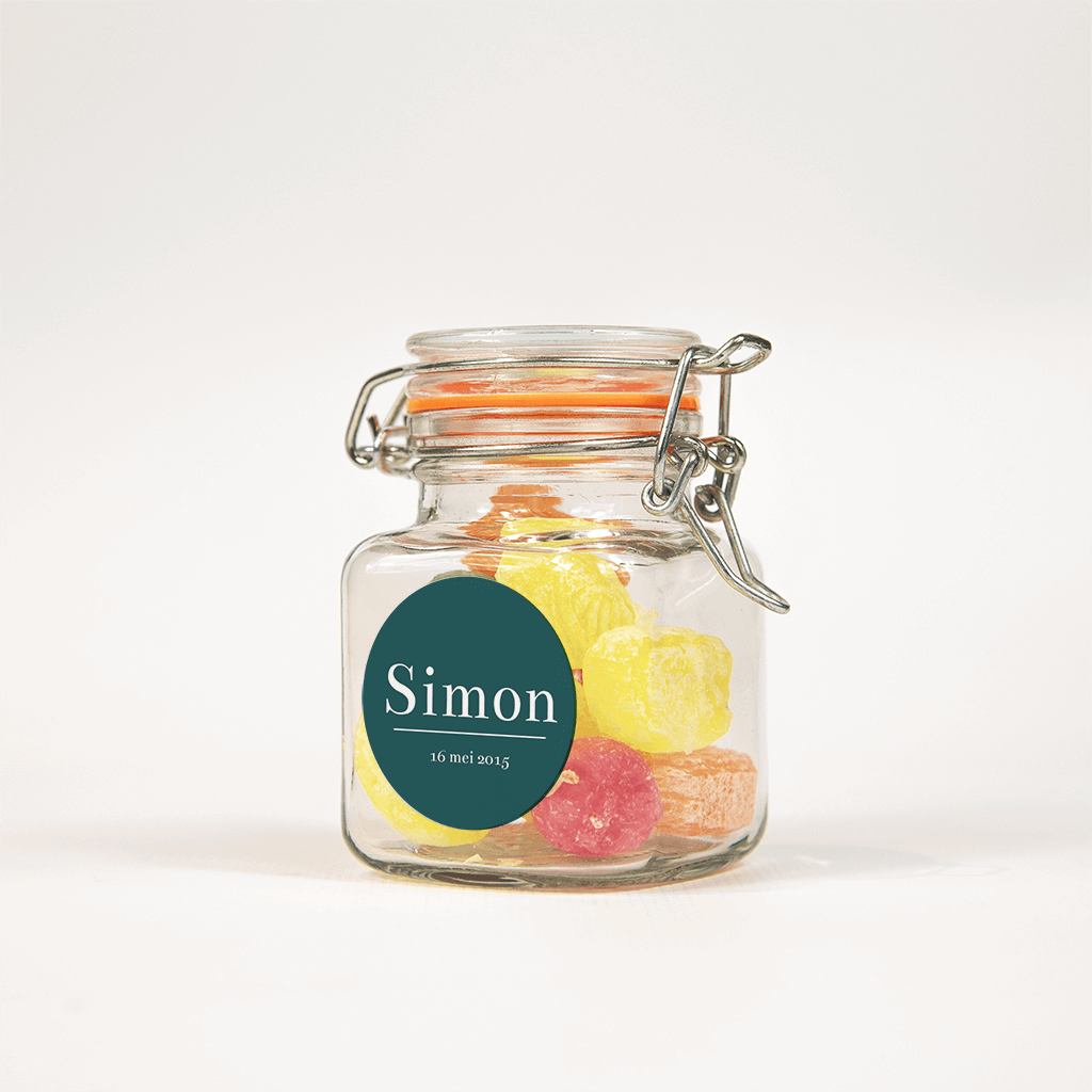 Moderne minimalistische sticker passend bij de communie-uitnodiging. Op de blauwgroene achtergrond staat de naam en datum in het midden in witte trendy letters, stoere sticker!