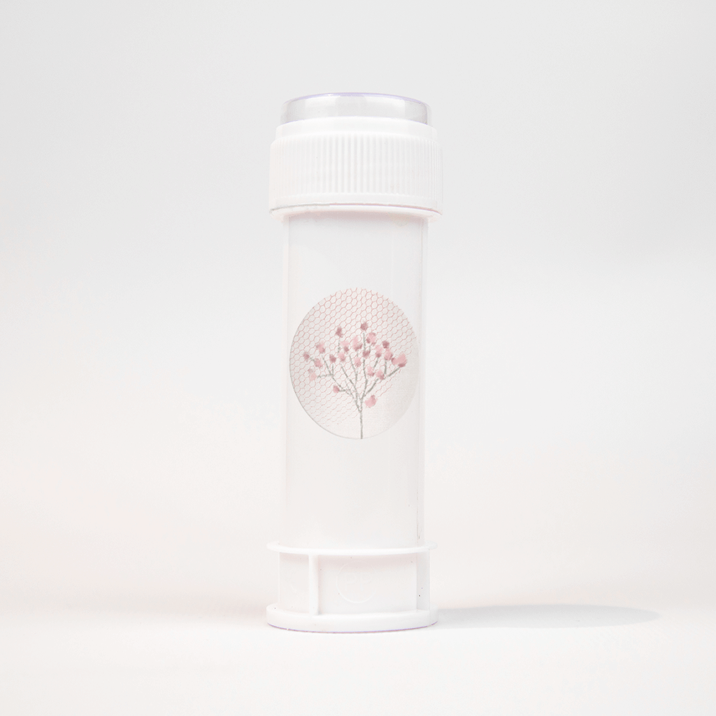 Lieve sluitsticker met tule en getekend takje met kleine roze bloemetjes.