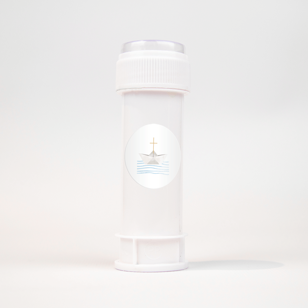 Sticker communie met bootje en goudfolie kruis.