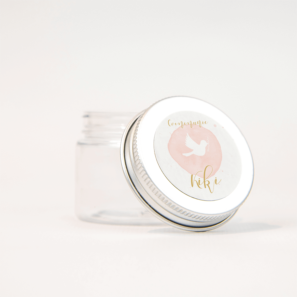 Trendy bijpassende sticker voor de uitnodiging voor de communie van jullie dochter. In het roze waterverf-vlak is een witte duif te zien, de naam onder het woord communie komt mooi naar voren en zorgt voor een persoonlijk accent op de enveloppe.