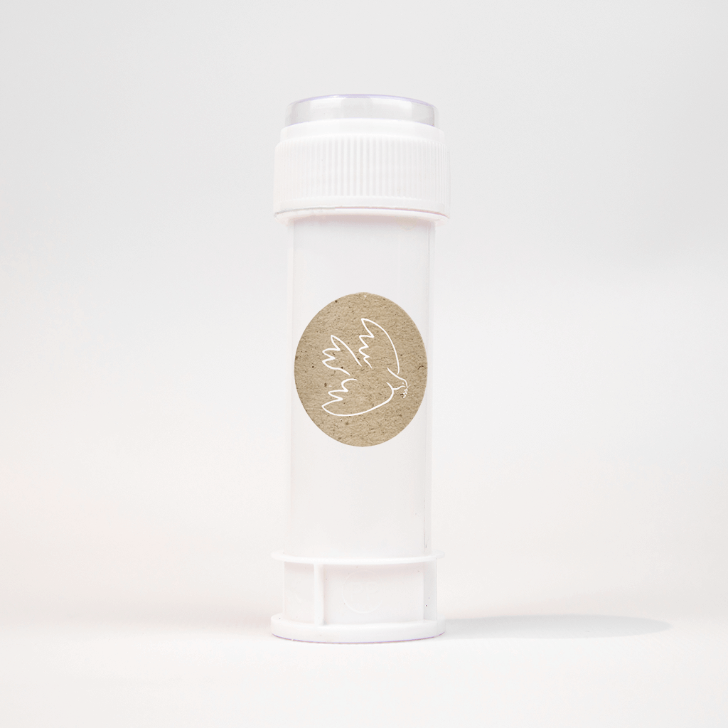 Deze sticker met een kraft-look achtergrond past perfect bij de communie-uitnodiging, met een getekende duif met olijftak in wit.