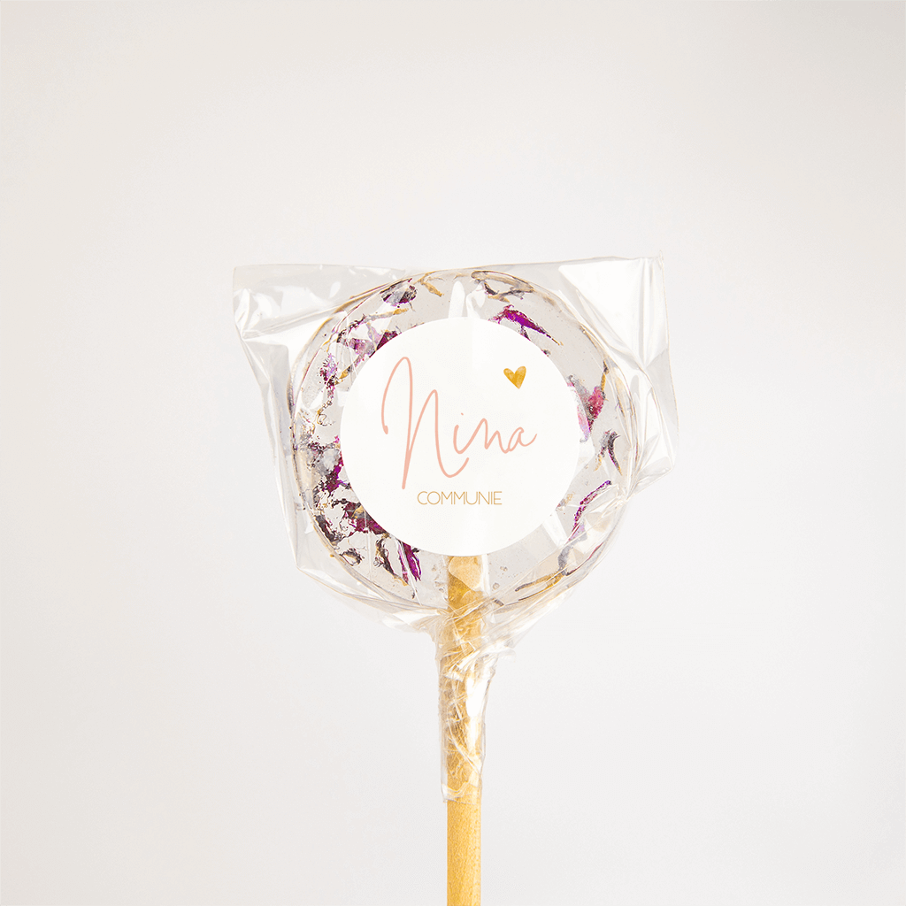 Een lieve, bijpassende sticker bij de uitnodiging voor de communie van jullie dochter. De naam staat in trendy letters centraal en het kleine hartje zorgt voor een lief accent. Onder de naam 'communie'; met deze sticker op de enveloppe wordt de bedoeling meteen duidelijk en geef je deze uitnodiging een extra persoonlijk accent.
