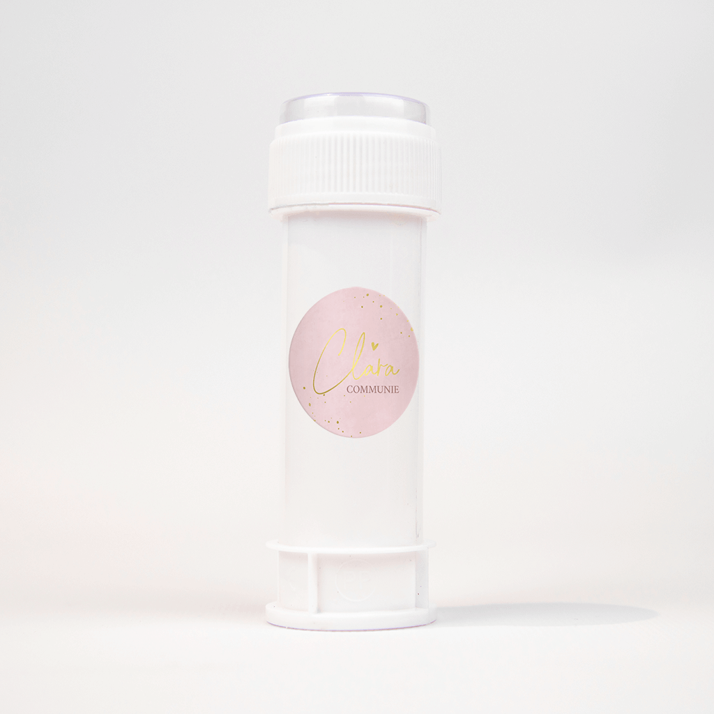 Leuke bijpassende sticker bij de communiekaart, op een roze watercolour achtergrond staan kleine confetti stipjes, de naam staat in sierlijk handschrift in goudfolie met een klein hartje erboven - per 25 stuks van 35 mm ø.