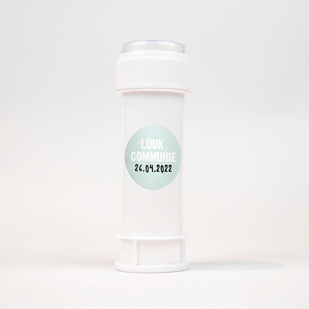 Een mooie bijpassende sticker bij de uitnodiging communie, met de naam en 'communie' in stoere witte letters! Daaronder de datum van de communie in zwart, waarmee je de belangrijkste info bij elkaar hebt.