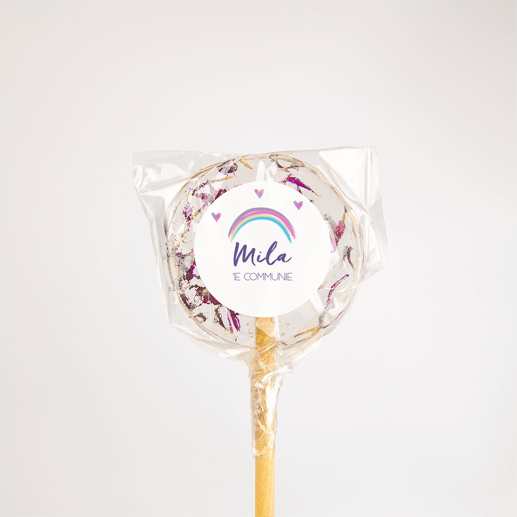 Vrolijke bijpassende sticker bij het communie-kaartje van jullie dochter. De naam staat in hip lettertype in het midden met eronder '1e communie', zo zie je gelijk van wie het kaartje is. Boven de naam een regenboog in felle kleurtje met drie hartjes in regenboogkleuren, helemaal trendy!