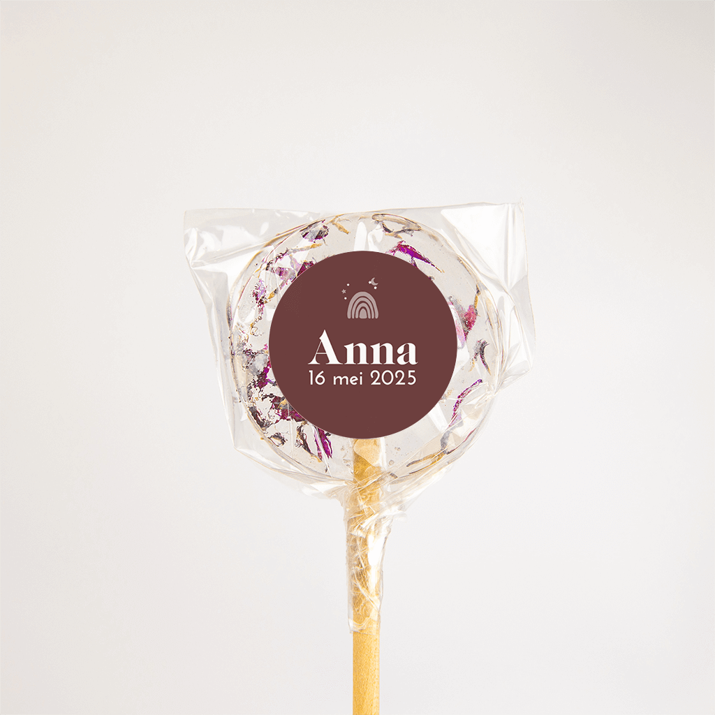Deze aubergine paarse sticker is precies in de stijl van de communie-uitnodiging. De naam en de datum staan duidelijk centraal, zo heb je meteen de belangrijkste informatie. Boven de naam een regenboogje met sterren en maan, helemaal hip!