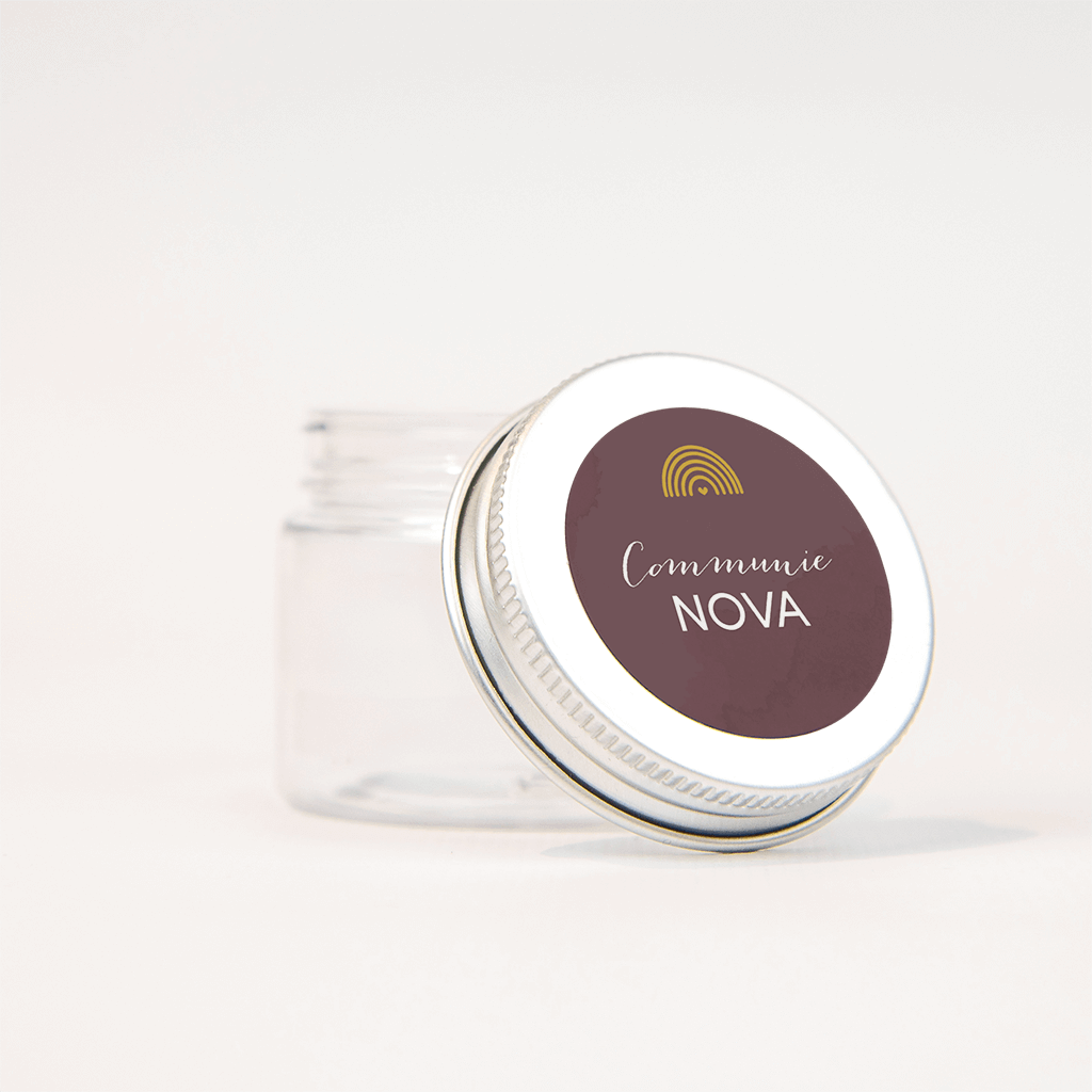 Deze moderne paarse sticker past helemaal bij de foto communiekaart. Onder de kleine regenboog met hartje staat de naam en 'communie' in moderne typografie. Met een sticker plak je de envelopjes eenvoudig dicht en geef je meteen een persoonlijk tintje aan jullie uitnodiging!