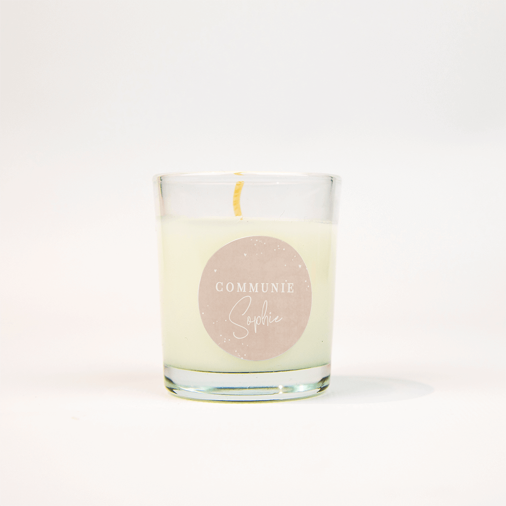 Deze sticker past bij de communie-uitnodiging in ballonvorm. Op de pastel-roze achtergrond staat de naam en 'communie' in hippe witte typografie. De kleine hartjes en spetters maken het tot een mooi geheel!