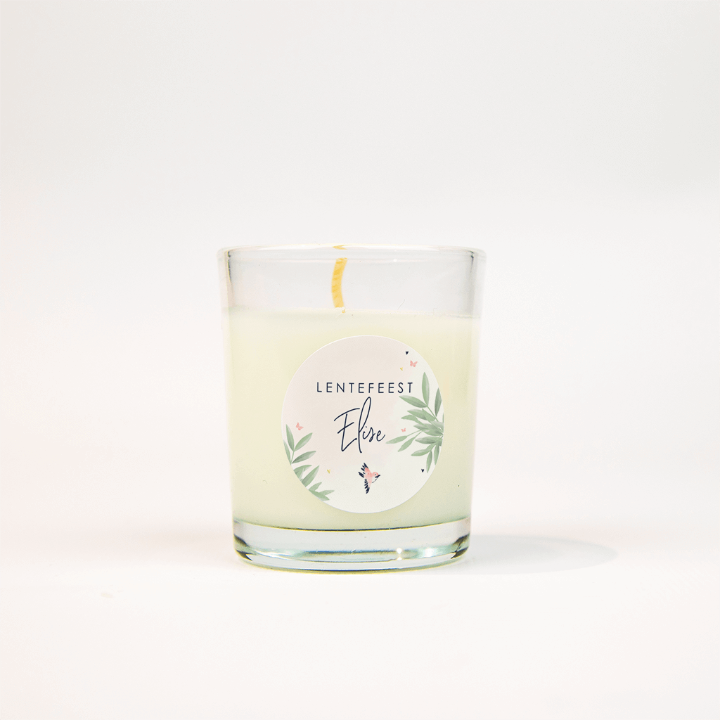 Bijpassende sticker bij het lentefeestkaartje met foto. Op de zachtroze achtergrond komt de naam en 'communie' mooi naar voren. De takjes langs de rand, het vogeltje en de vlinders en hartjes maken er een romantisch tafereel van.