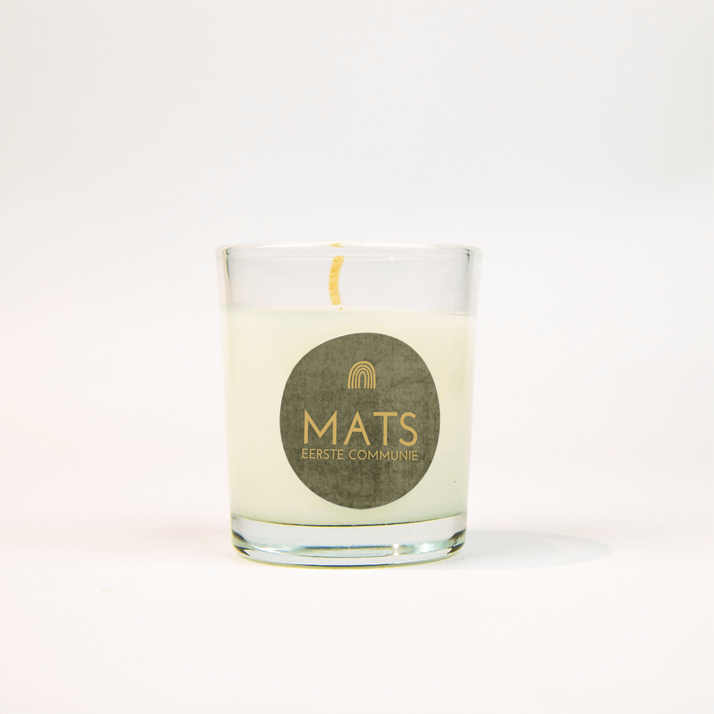 Bijpassende sticker bij de communie uitnodiging. Op een olijfgroene velvetlook achtergrond staat de naam van jullie zoon en 'communie' in stoere strakke gele letters. De kleine regenboog in dezelfde kleur maakt het helemaal af.