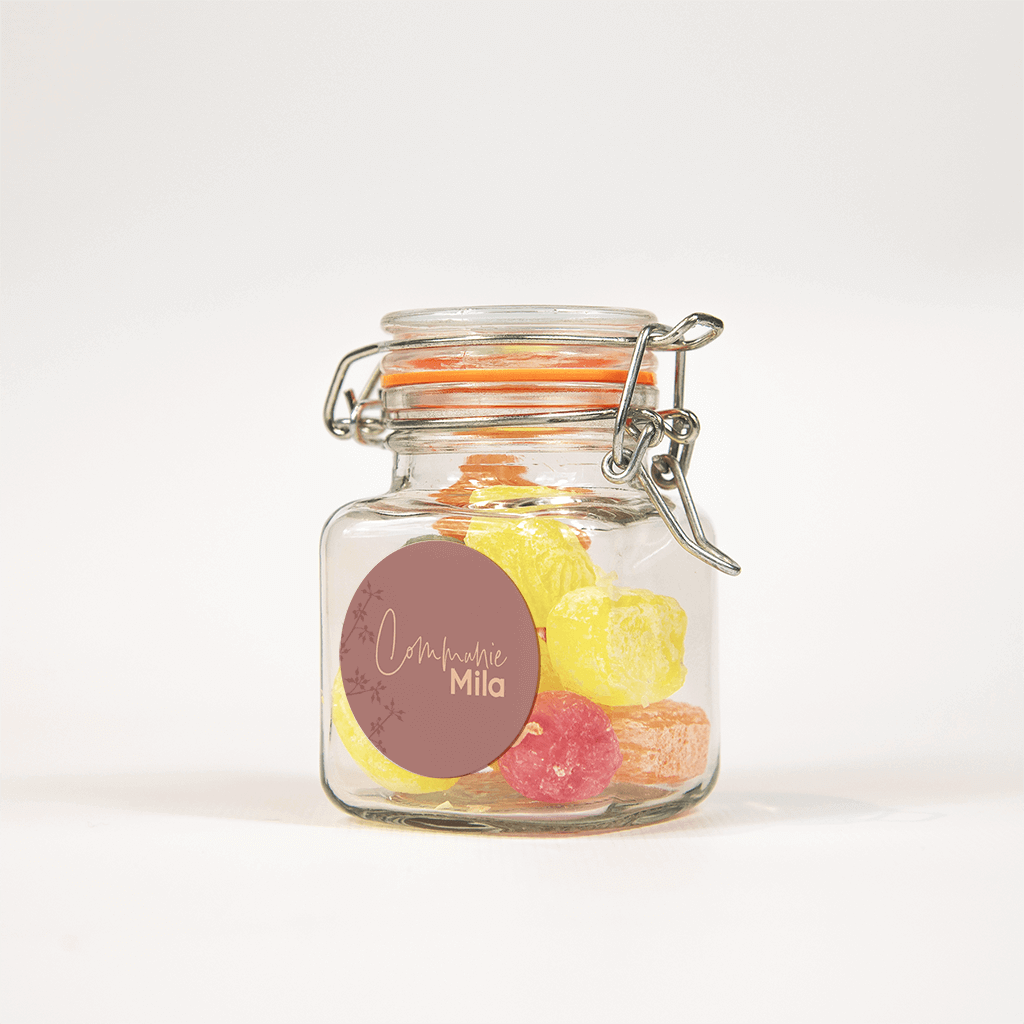 Bijpassende sticker bij de oudroze communie uitnodiging. Op de donkerroze achtergrond komt de zalmroze tekst mooi naar voren. Langs de rand staat het silhouet van een donkerroze takje.
