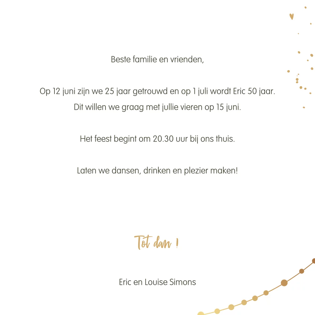 Time to party, want het is dubbel feest: 25 jaar getrouwd en 50e verjaardag! Stuur deze stoere kaart in krijtbordlook naar vrienden en familie, de feestelijke goudkleurige slingers en spetters maken het extra feestelijk. In de polaroid kaders kunnen twee leuke foto's worden toegevoegd, maak de kaart helemaal naar wens in de online editor.