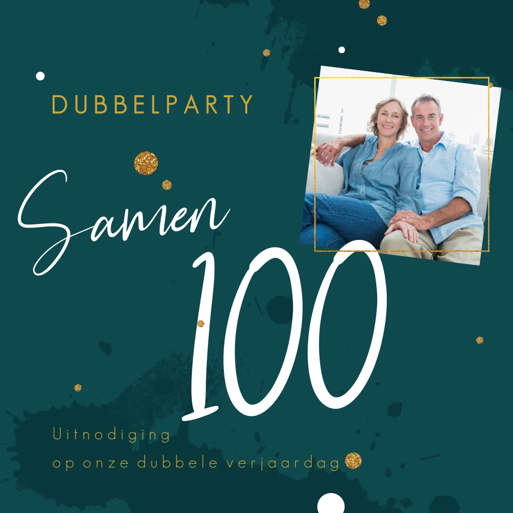 Jullie worden samen honderd, daar hoort een mooie uitnodiging bij! Op de donker petrol achtergrond met watercolour effect is ruimte om een leuke eigen foto te uploaden, door gebruik van verschillende lettertypes en kleuren een vrolijke kaart, pas deze naar wens aan in de online editor.