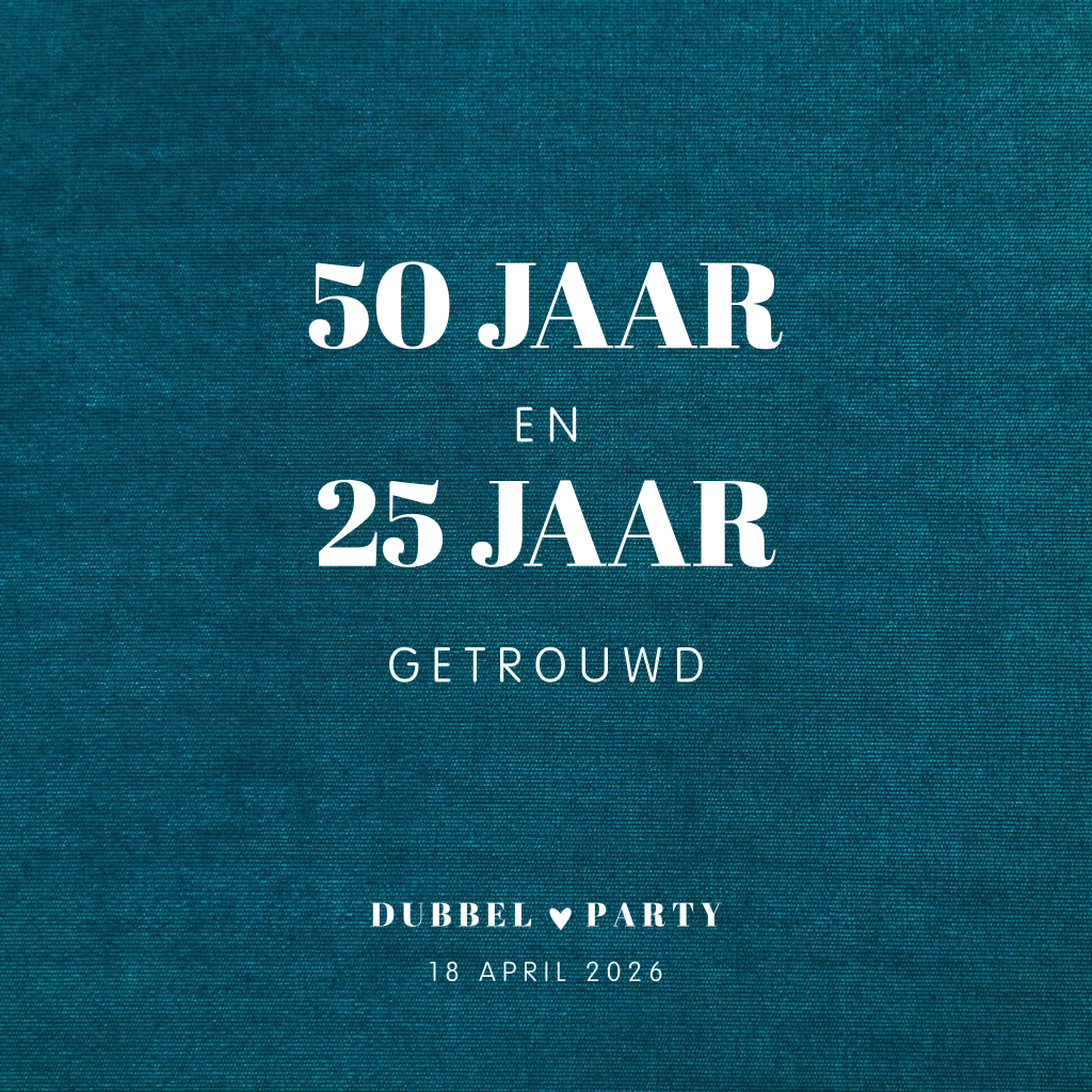 Een dubbel party: 25 jaar getrouwd en 50e verjaardag, tijd voor een mooie uitnodiging! Op deze vierkante kaart in jeanslook staat de tekst in luxe goudfolie, dat komt mooi naar voren op het donkerblauw. De tekst op de witte achterkant is in bijpassende kleuren, pas de kaart aan in de editor en verstuur in een petrolblauwe enveloppe, mooi!