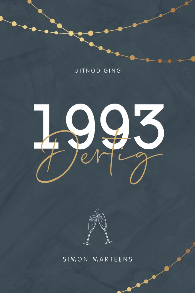 Leuke uitnodiging voor een dertigste verjaardag: op een donkerblauwe achtergrond staan feestelijke, goudkleurige feestslingers. De tekst staat in wit en goudkleur, op de witte achterzijde in blauw en goud. De klinkende champagneglazen maken het compleet, time to party! Pas de kaart naar wens aan in de editor en bestel een proefdruk.