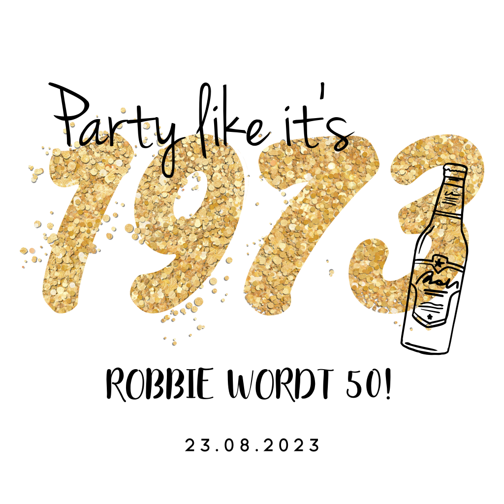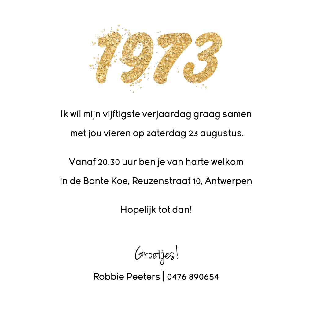 Feestelijke uitnodiging met witte achtergrond en zwarte tekst. De tekst staat in een speels lettertype. Groot staat het geboortejaar met een vrolijke glitter look. Pas de tekst aan in de online editor voor een persoonlijke kaart.