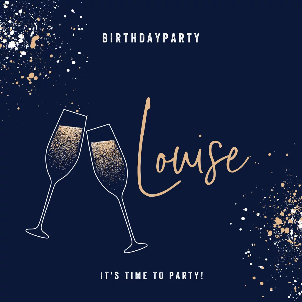 Stijlvolle uitnodiging voor een verjaardag in blauw en goudgeel. Op de voorkant staan twee klinkende champagneglazen met bubbels en confetti langs de rand. Ook op de gele achterkant staat confetti, pas de tekst naar wens aan in de online editor.