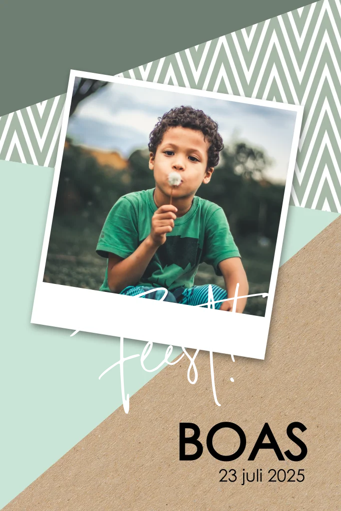 Een stoere uitnodiging voor de verjaardag van een jongen met schuine vlakken in verschillende kleuren groen en kraftlook. In het fotokader op de voor- en achterkant kun je een eigen foto uploaden. Met de tekst in sierlijke letter van goudfolie is het een feestelijke kaart!