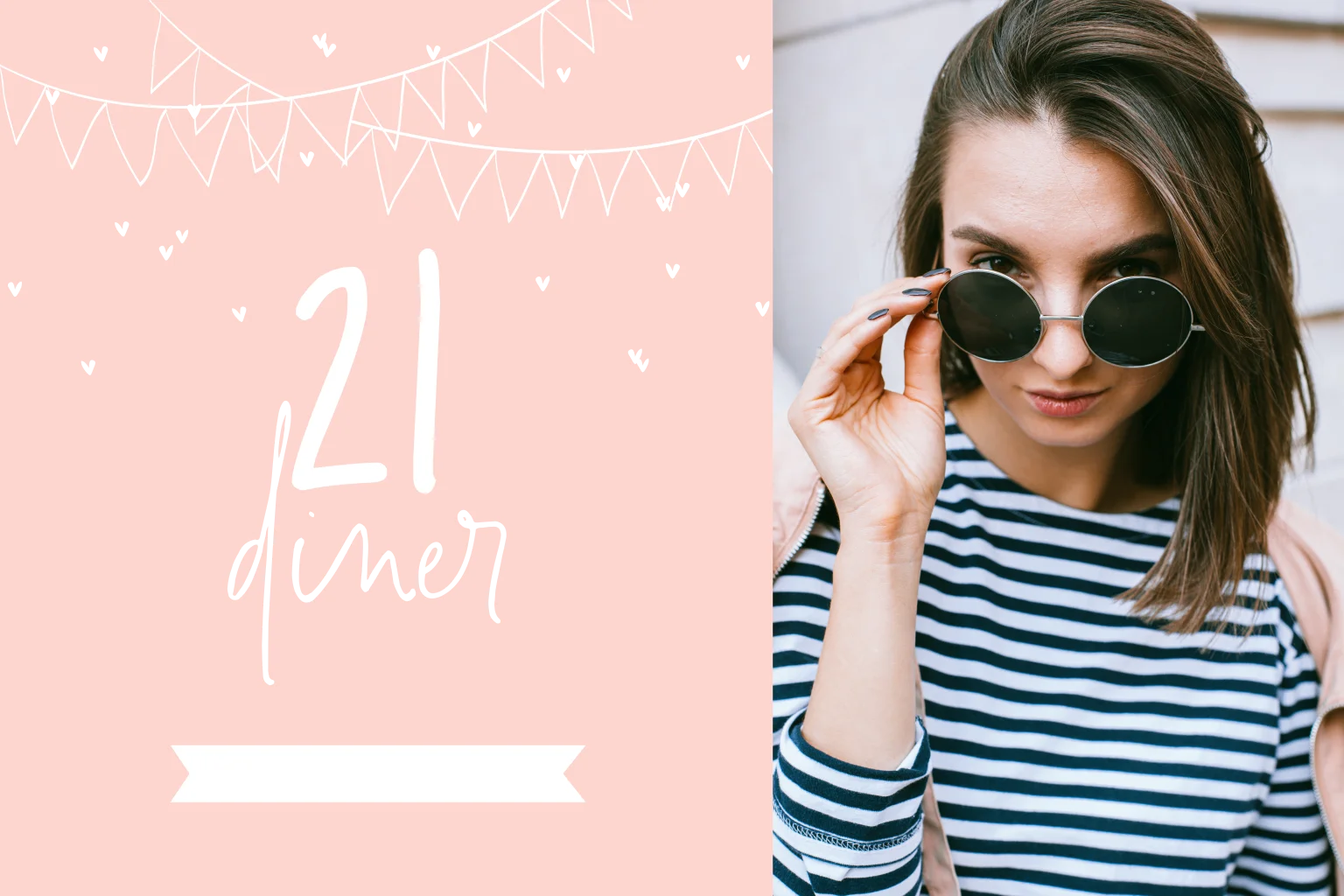 Nodig al je vrienden uit voor een speciaal 21 diner met deze hippe uitnodiging! Je kunt zelf een mooie foto plaatsen in het ruime fotokader. De kaart krijgt een extra speciale look door de roségoudfolie hartjes en tekst. Je kunt de roze achtergrond en de teksten eenvoudig aanpassen in de online editor.
