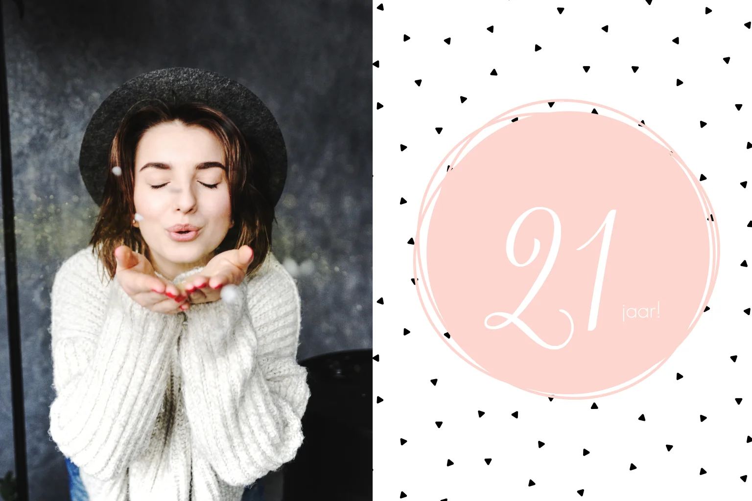 Een hippe uitnodiging voor jouw 21ste verjaardag in liggend formaat enkel. Op een witte achtergrond staan zwarte driehoekjes met daarop een roze cirkel en jouw leeftijd in een trendy lettertype. Zet je mooiste foto ernaast en je kaart is helemaal af! Toch liever een ander kleurtje of typografie? Pas het eenvoudig aan in de online editor, zo gedaan!