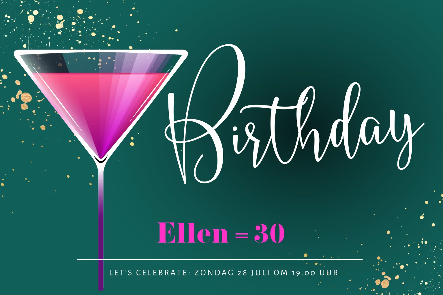 Hippe donkergroene verjaardagsuitnodiging met fuchsia roze cocktail glas en gouden spikkels. Een unieke uitnodiging voor een uniek feest. De perfecte uitnodiging voor een 30, 40 of 50-jarige verjaardag.