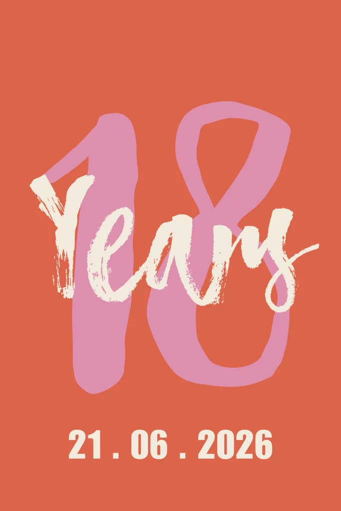 Hippe uitnodiging voor je achttiende verjaardag met colourblock van rood en roze. De 18 staat in grote cijfers met witte 'years' er doorheen en de datum eronder. Op de beige achterkant is ruimte voor de tekst van de uitnodiging, pas de kaart eenvoudig zelf aan in de online editor.