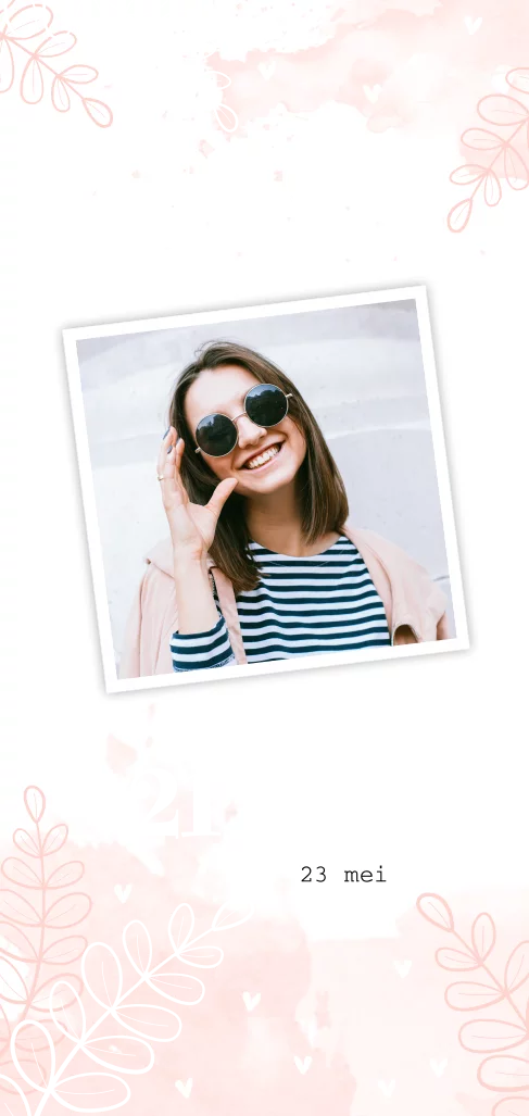 Nodig je vrienden en familie uit met deze mooie uitnodiging voor jouw 21ste verjaardag! In het kader kun je een mooie foto van jezelf plaatsen. De takjes en naam in roséoudfolie komen mooi uit op de roze waterverf achtergrond.