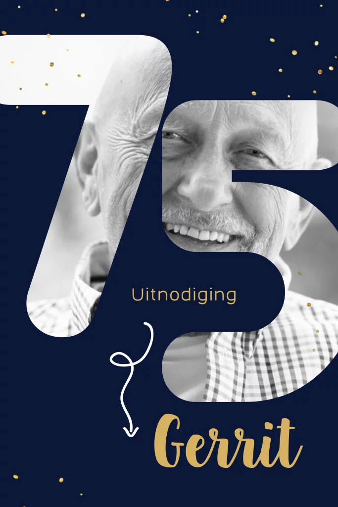 Leuke uitnodiging voor een 75ste verjaardag! De foto staat achter de uitgesneden grote 75. De donkerblauwe achtergrond geeft aan deze kaart een chique uitstraling.