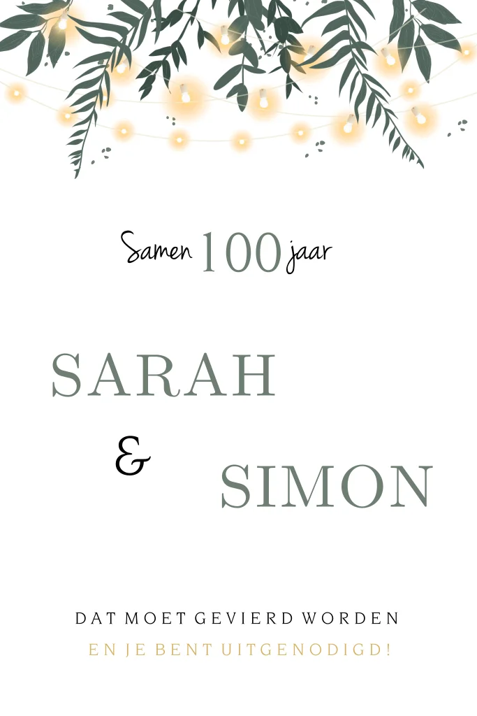Samen honderd jaar, dat moet gevierd worden! Op deze witte kaart staat een vrolijke lichtjesslinger tussen de groene takken op de voor en achterkant. De tekst staat in bijpassende kleuren in hippe lettertypes, pas deze naar wens aan in de online editor.
