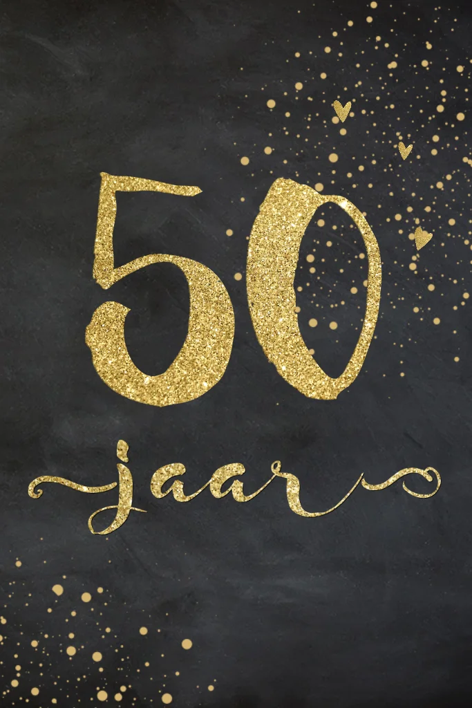 Stijlvolle uitnodiging voor een 50ste verjaardag met gouden look letters, met daarachter gouden hartjes en confetti. Door de donkere achtergrond krijgt de kaart een luxe uitstraling. Wil je liever een andere kleur en of tekst? Dat kan! In de online editor pas je dit eenvoudig zelf aan.