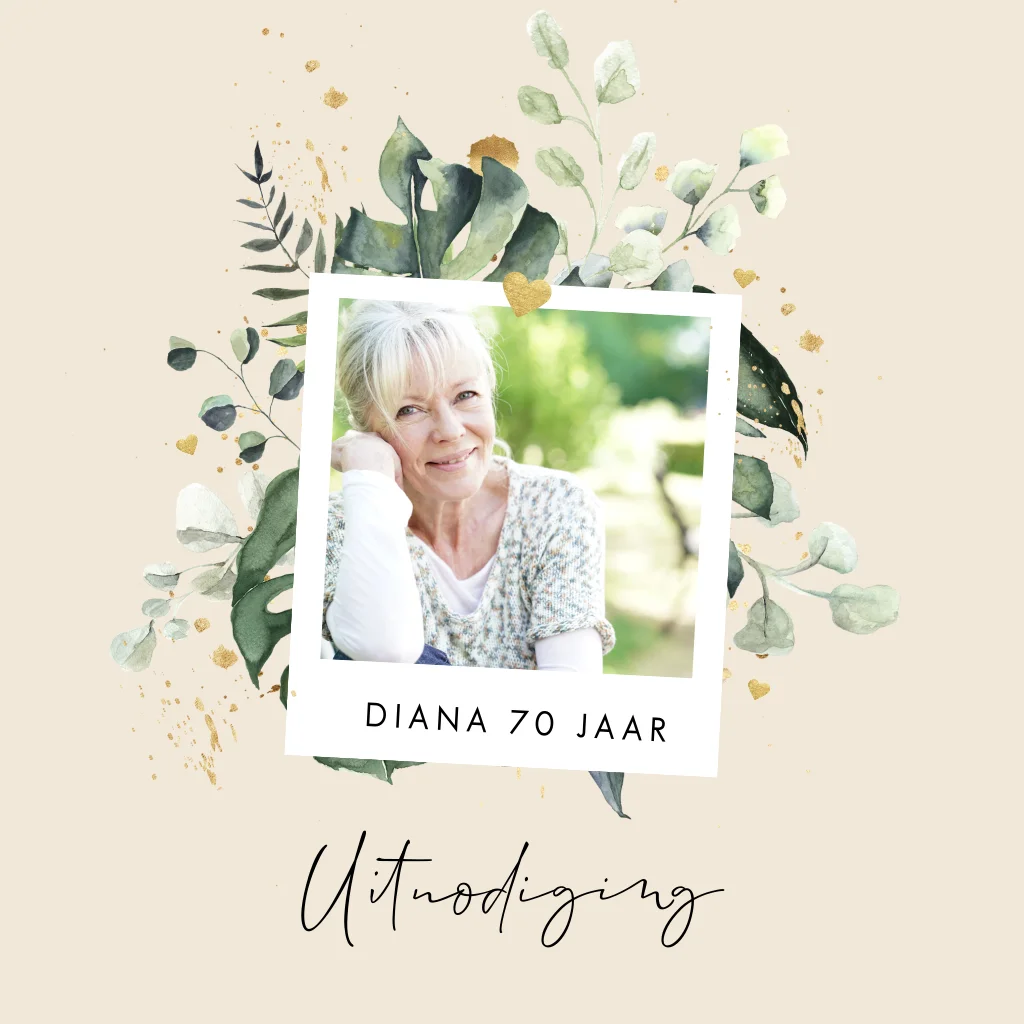 Stijlvolle uitnodiging voor 70e verjaardag met polaroid en takjes