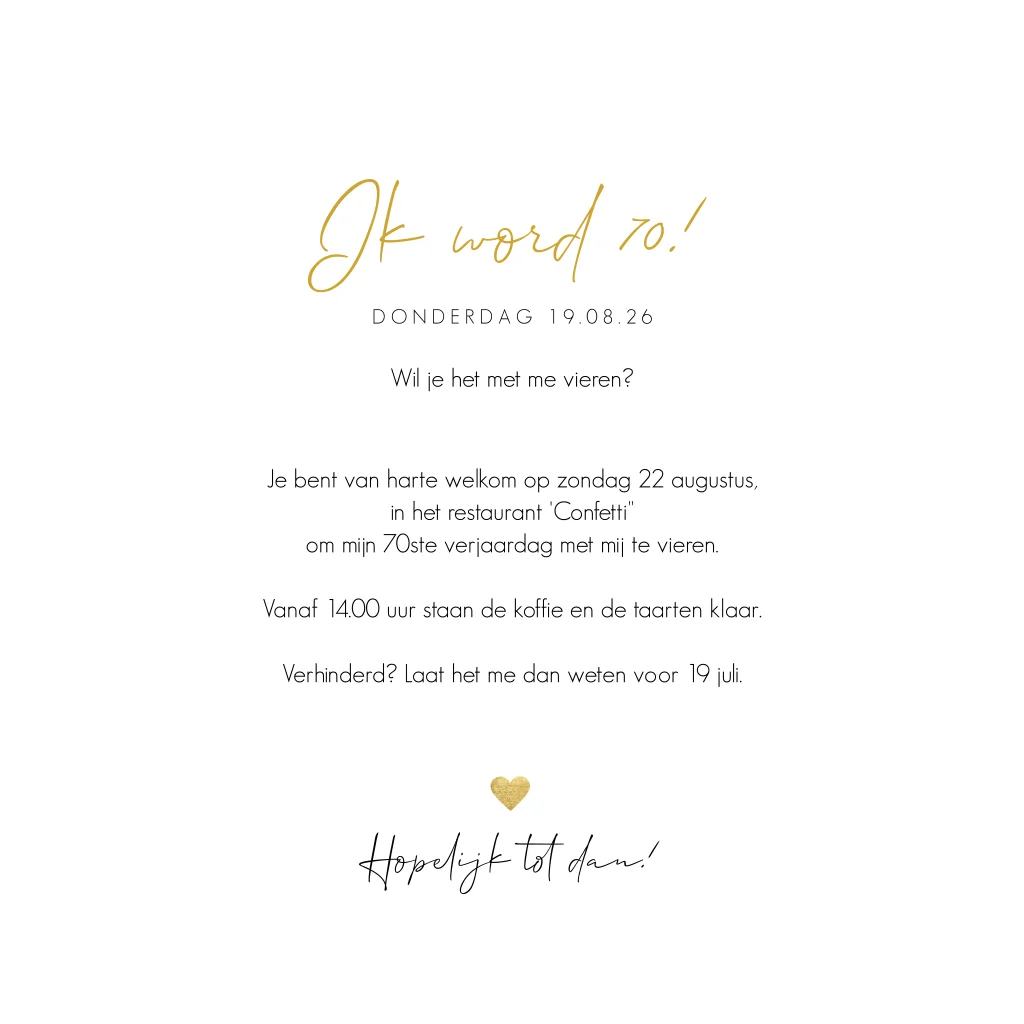 Chique uitnodiging voor een zeventigste verjaardag, op de zandkleurige kaart staat een mooi bloemendesign in het midden. Op de voorkant is ruimte om een eigen foto te uploaden, aan de binnenzijde kan de eigen tekst voor de uitnodiging worden geplaatst, ga aan de slag in de online editor en bestel een proefdruk.
