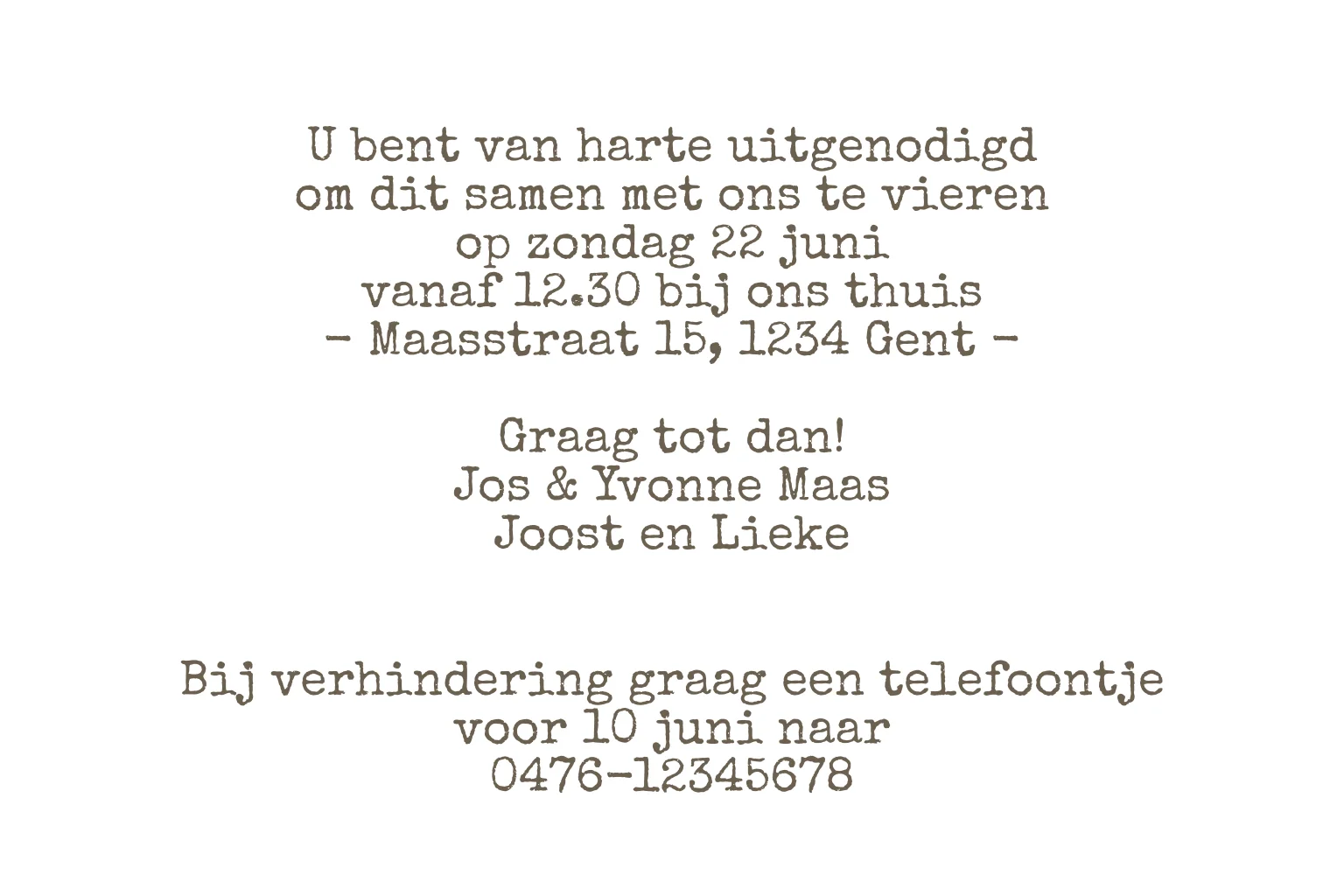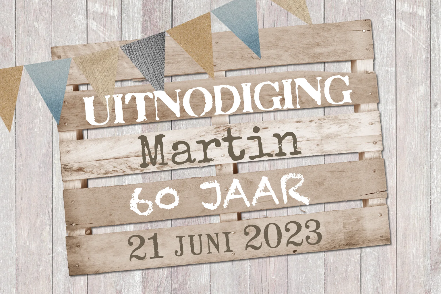 Originele uitnodiging voor een 60ste verjaardag! Wegwijzer met verschillende lettertypes in bruin en wit en een vlaggenlijn. In de editor kun je de tekst naar wens aanpassen.