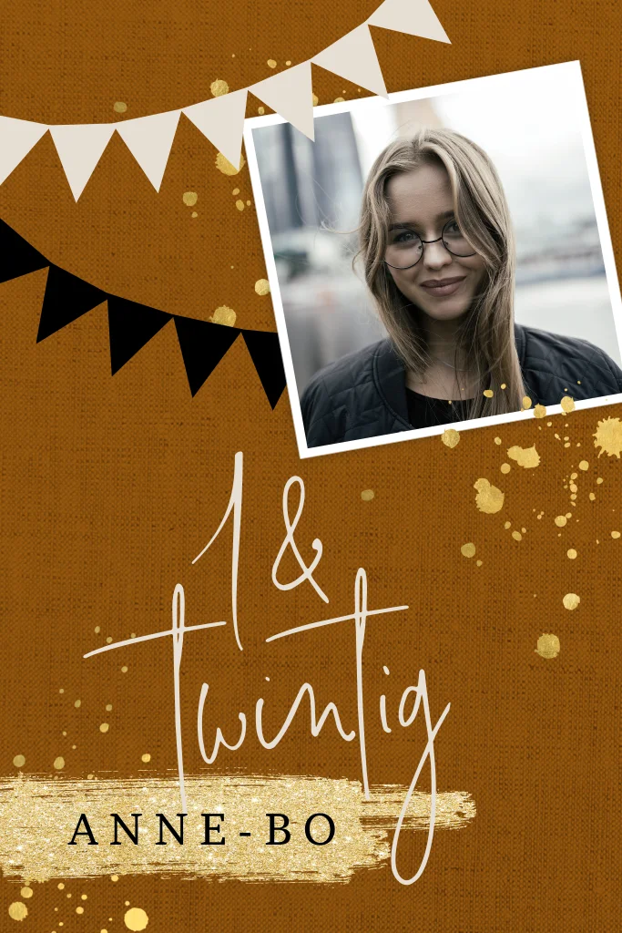 Een feestelijke uitnodiging voor jouw 21ste verjaardag. Op de bruine kaart is aan twee kanten ruimte om een eigen foto toe te voegen, zo maak je de kaart persoonlijk. De slingers en gouden details maken de uitnodiging helemaal af.