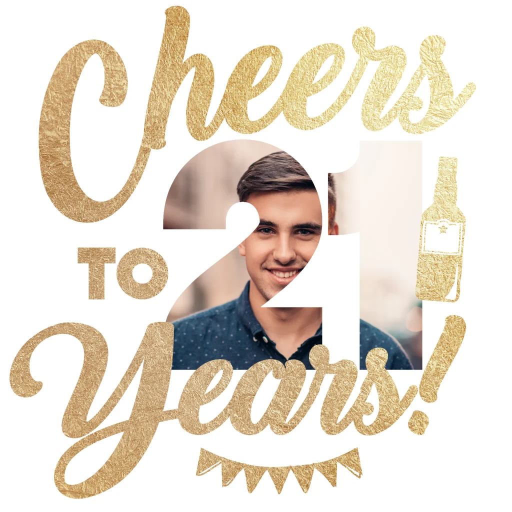 Originele uitnodiging voor een verjaardag! De foto staat in de cijfers "21". In de editor kun je naar wens de tekst aanpassen.