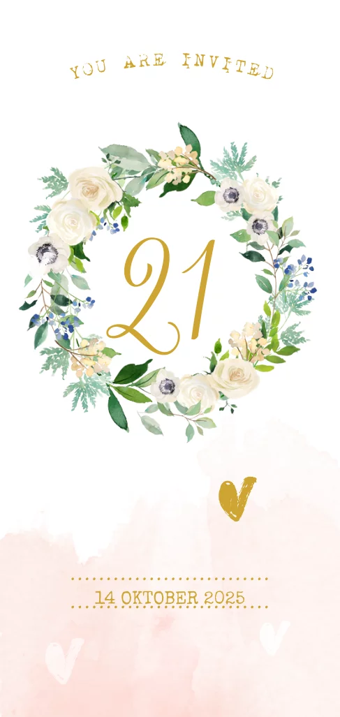 Een stijlvolle uitnodiging voor jouw 21ste verjaardag met het cijfer 21 in een mooie bloemenkrans. Natuurlijk is deze kaart ook te gebruiken voor een andere verjaardag, in de online editor pas je zo zelf de leeftijd aan! Onderaan de kaart een vlak in roze waterverf met hartjes. De gouden details maken de kaart extra feestelijk.