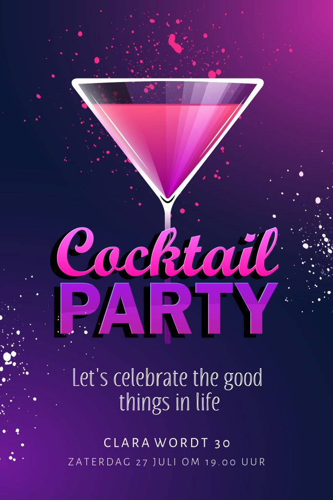 Vrolijke uitnodiging in paars en roze voor een spetterend feest voor je dertigste verjaardag. De tekst staat in bijpassende lettertypes, maak de kaart naar wens in de online editor.