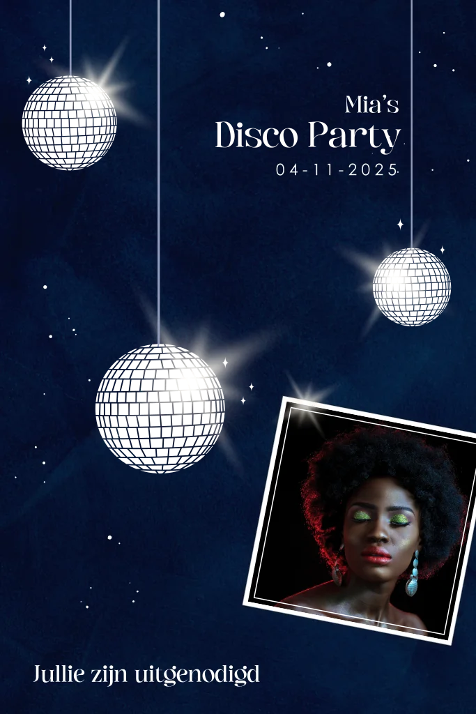 Hippe uitnodiging voor je dertigste verjaardag: tijd voor een disco party! Op de donkerblauwe kaart staan discobollen in zilver en paars, in het kader kun je een eigen foto uploaden. De tekst staat in holografische folie, dat past perfect bij het discothema.