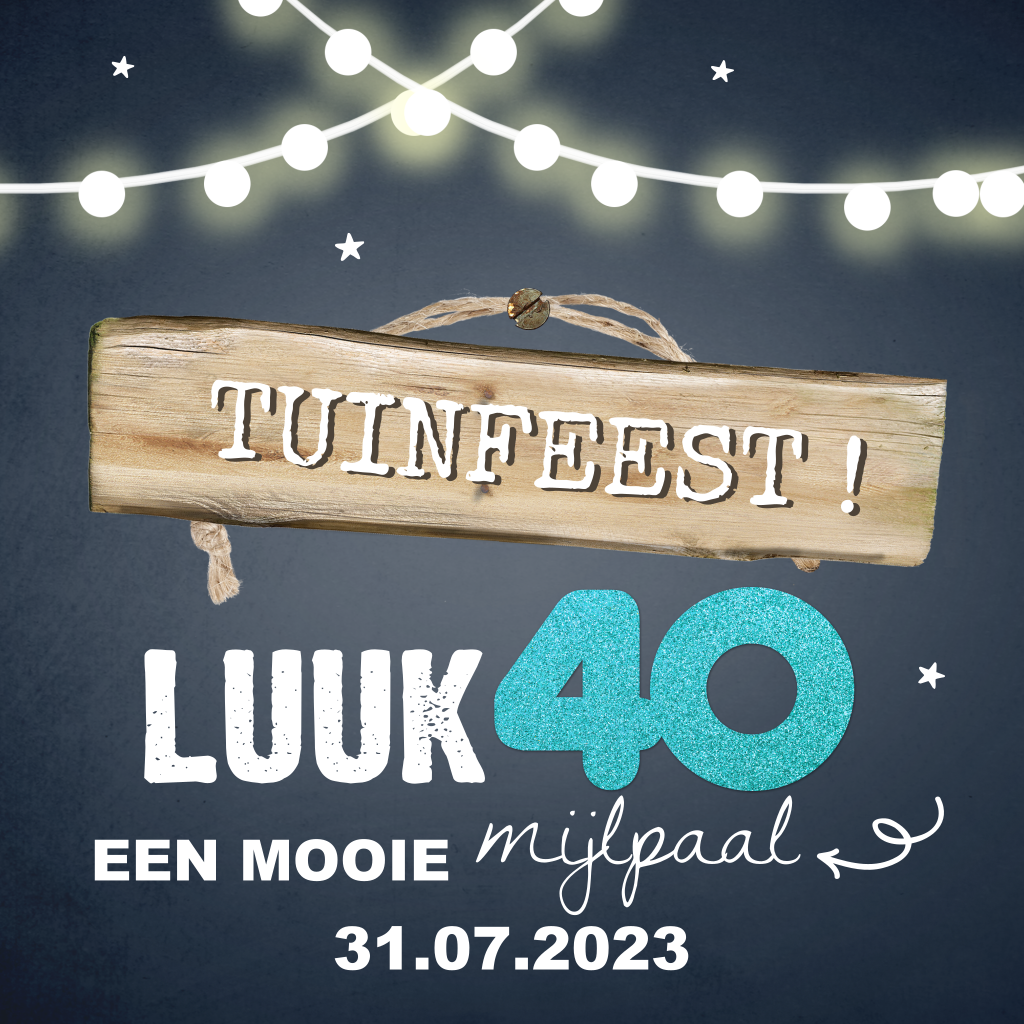 Stoere uitnodiging met lampenslingers en sterretjes op een donkergrijze achtergrond. In de editor is het gemakkelijk om de tekst aan te passen.