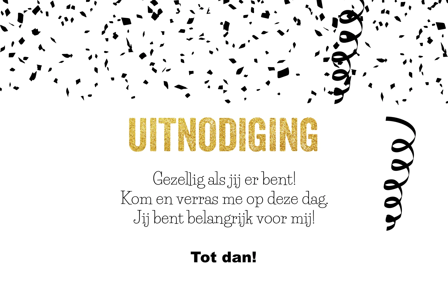 Originele uitnodiging in zwart wit met leuke slingers! In het jaartal is er ruimte voor een eigen foto. Het gouden "Partytime" maakt deze kaart helemaal af!