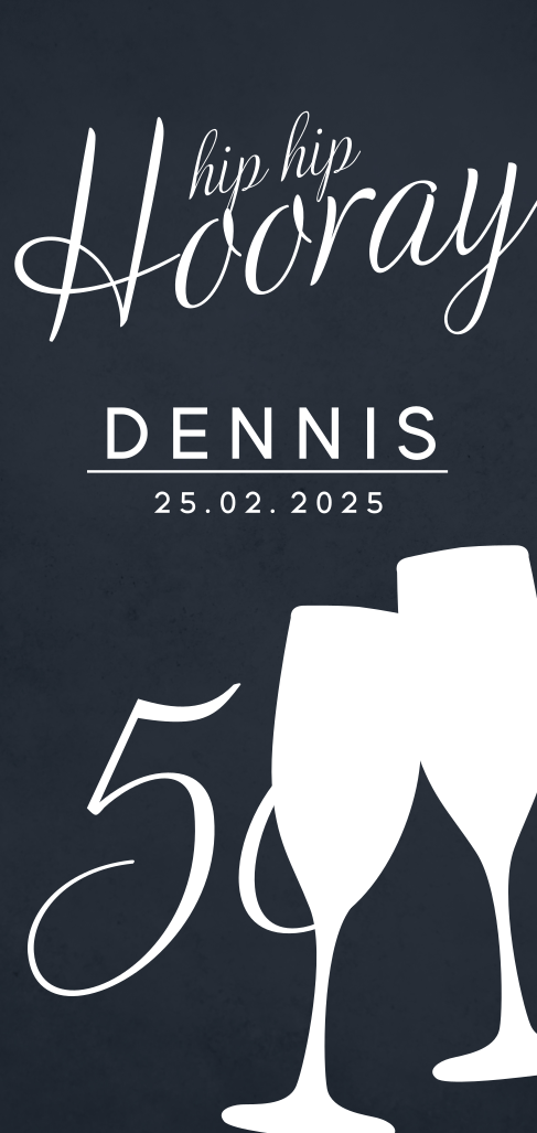 Stijlvolle uitnodiging voor de 50e verjaardag van een man, met witte champagneglazen en tekst in goudfolie op een donkerblauwe achtergrond. Pas de kaart naar wens aan in de online editor.