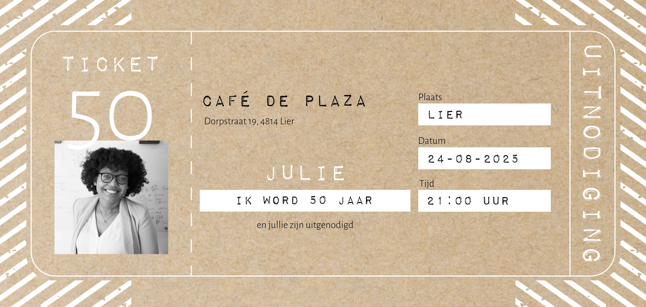 Originele uitnodiging in ticketvorm van kraftlook voor een vijftigste verjaardag. Op de beige kaart staat de tekst afwisselend in wit en zwart en luxe goudfolie voor een extra feestelijk accent. Op de voorkant is ruimte om een eigen foto te uploaden in de online editor, daar pas je ook de teksten naar wens aan.