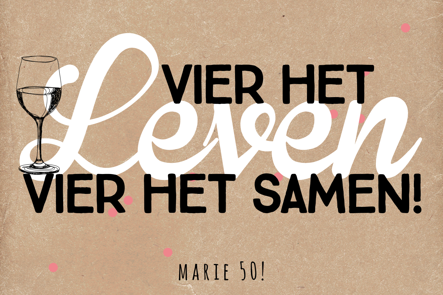 Vier je 50e verjaardag gezellig samen met al je familie en vrienden. Uitnodiging met kraft achtergrond, bijpassende tekst en roze confetti.