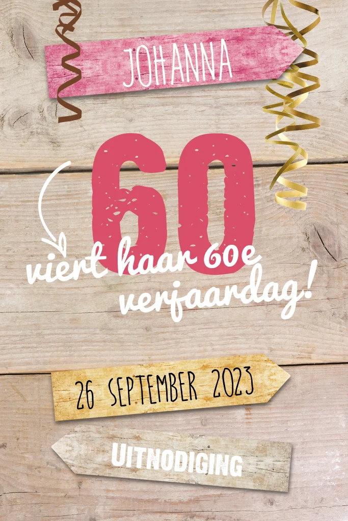 Uitnodiging 60 jaar met wegwijzer en slingers