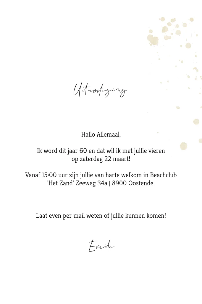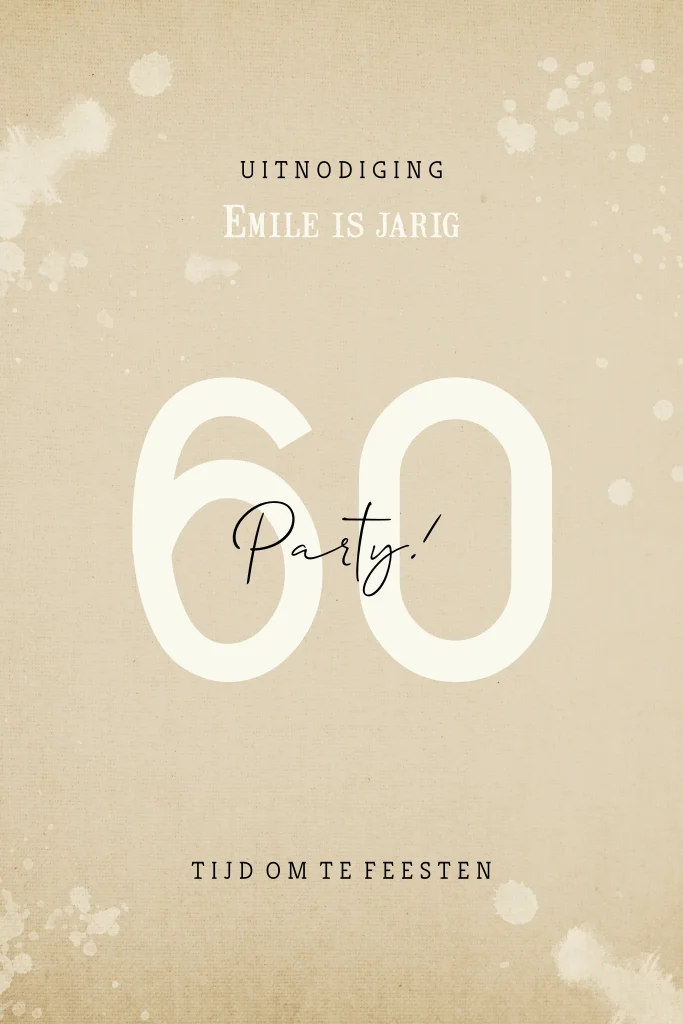 Rustige uitnodigingskaart voor een zestigste verjaardag in zandkleur en wit met spetters. Maak de kaart naar wens met eigen tekst en lettertypes naar smaak in de online editor.