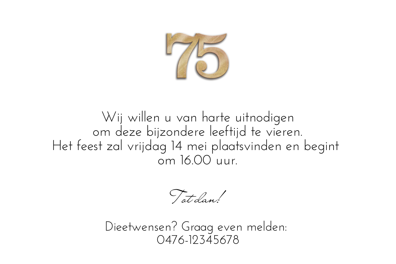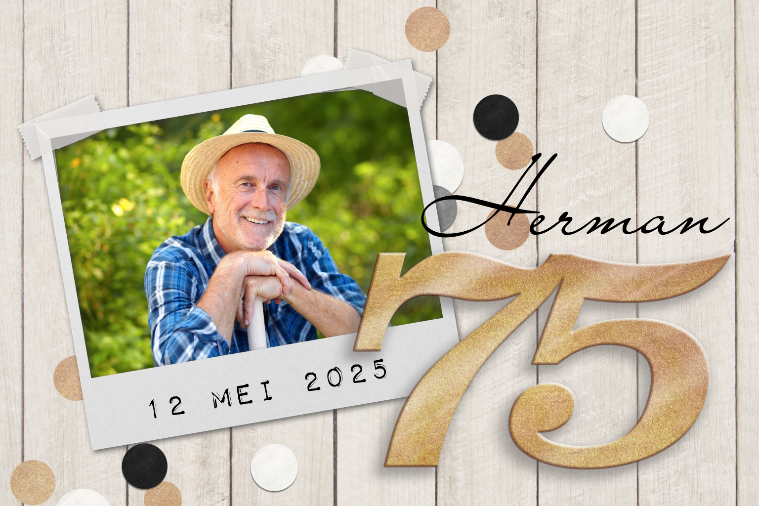 Wat een persoonlijke uitnodiging voor je 75ste verjaardag! Op de voorkant van de kaart is er ruimte voor een eigen foto. De confetti en de gouden cijfers op een houten achtergrond maken deze kaart af!