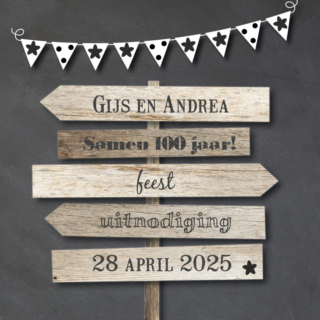 Uitnodiging samen 100 jaar met slinger en houten wegwijzer