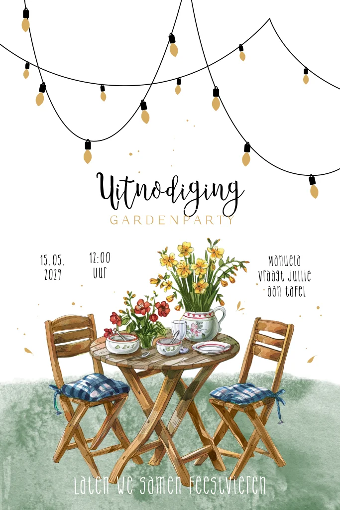 Uitnodiging voor een tuinfeest met slingers en een tuintafel